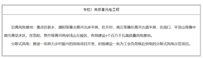積極推進集中式風電規(guī)模化開發(fā)。堅持生態(tài)環(huán)境優(yōu)先,錨定新增靈活調(diào)節(jié)能力和用電負荷增長,根據(jù)風能資源分布規(guī)律,加快風能資源規(guī)模化開發(fā)利用。在京廣鐵路以西及大別山區(qū)域優(yōu)先采用風電與傳統(tǒng)電源、抽水蓄能電站一體化開發(fā)模式,打造一批多能互補示范項目;在京廣鐵路以東平原區(qū)域,支持風能就近開發(fā)就地消納??茖W布局沿黃綠色能源廊道,做好水土保持、生態(tài)修復和林地恢復,以沿黃淺山丘陵和中東部平原地區(qū)為重點,加快建設4個百萬千瓦高質(zhì)量風電基地。