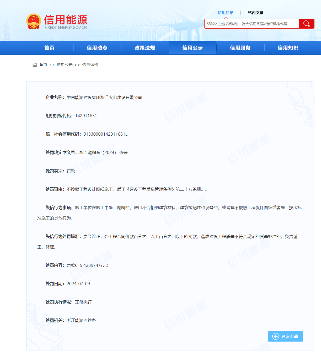 浙江能源監(jiān)管辦發(fā)布的《行政處罰決定書(shū)》(浙監(jiān)能稽查〔2024〕39號(hào))中依據(jù)《建設(shè)工程質(zhì)量管理?xiàng)l例》(下稱“條例”)第六十四條對(duì)中國(guó)能建浙江火電處以了619萬(wàn)余元的罰款。條例明確:施工單位在施工中偷工減料的,使用不合格的建筑材料、建筑構(gòu)配件和設(shè)備的,或者有不按照工程設(shè)計(jì)圖紙或者施工技術(shù)標(biāo)準(zhǔn)施工的其他行為的,責(zé)令改正,處工程合同價(jià)款百分之二以上百分之四以下的罰款;造成建設(shè)工程質(zhì)量不符合規(guī)定的質(zhì)量標(biāo)準(zhǔn)的,負(fù)責(zé)返工、修理,并賠償因此造成的損失;情節(jié)嚴(yán)重的,責(zé)令停業(yè)整頓,降低資質(zhì)等級(jí)或者吊銷資質(zhì)證書(shū)。
