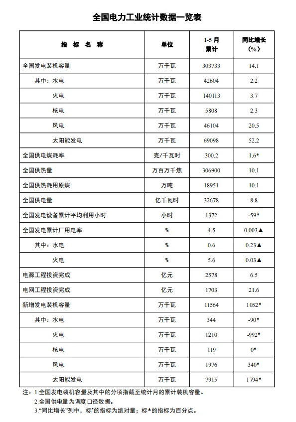 1-5月份,全國發(fā)電設(shè)備累計(jì)平均利用1372小時(shí),比上年同期減少59小時(shí)。1-5月份,全國主要發(fā)電企業(yè)電源工程完成投資2578億元,同比增長6.5%。電網(wǎng)工程完成投資1703億元,同比增長21.6%。