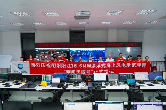 “明陽天成號”由明陽集團自主研制,為全球首次在一個浮式基礎(chǔ)上搭載兩臺8.3兆瓦海上風機,總裝機容量達到16.6兆瓦,是目前全球最大的漂浮式風電平臺,平臺排水總量約1.5萬噸,投運于離岸約70公里、水深約45米的明陽陽江青洲四海上風電場,預(yù)計每年可提供約5400萬度綠色電力,能滿足3萬戶三口之家一年的日常用電需求。
