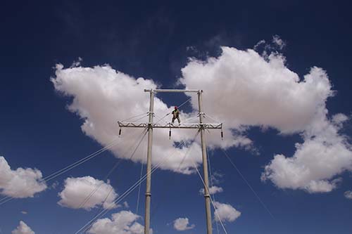 項(xiàng)目架空線路桿塔共計(jì)668基,12種桿塔型式。桿塔是在35kV架空線路架設(shè),線路總長度約122.21km,塔高為15-21米,屬于高空作業(yè)。施工現(xiàn)場干旱炎熱,沙塵暴和冰雹也常常輪番“光顧”,給施工進(jìn)度和安全管理帶來不小的挑戰(zhàn)。在桿塔組立作業(yè)前,項(xiàng)目部組織協(xié)作隊(duì)伍召開專題安全會(huì),施工隊(duì)長徐少帥堅(jiān)持對(duì)現(xiàn)場的施工操作人員進(jìn)行詳細(xì)的安全、技術(shù)、質(zhì)量交底工作;質(zhì)量安全科林周彬堅(jiān)持每天現(xiàn)場巡查,要求高空作業(yè)人員必須持證上崗,且具有合格的體檢報(bào)告;施工過程中,施工現(xiàn)場拉起安全警戒線、懸掛安全警示標(biāo)識(shí),安全員全程旁站監(jiān)督,確保現(xiàn)場施工安全質(zhì)量可控。