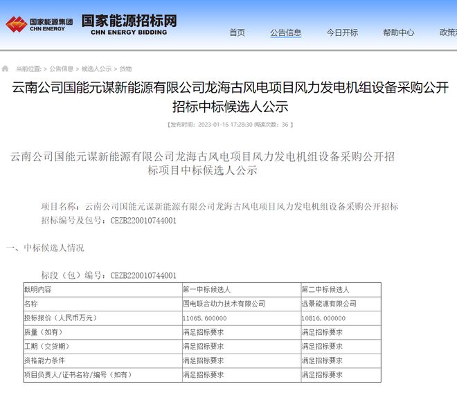 1月16日,云南公司國能元謀新能源有限公司龍海古風(fēng)電項(xiàng)目風(fēng)力發(fā)電機(jī)組設(shè)備采購公開招標(biāo)中標(biāo)候選人公示,規(guī)模共計(jì)52MW,國電聯(lián)合動(dòng)力預(yù)中標(biāo),投標(biāo)報(bào)價(jià)11065.6萬元。