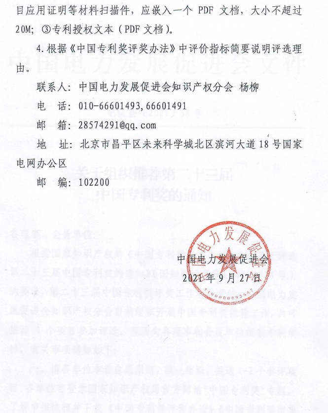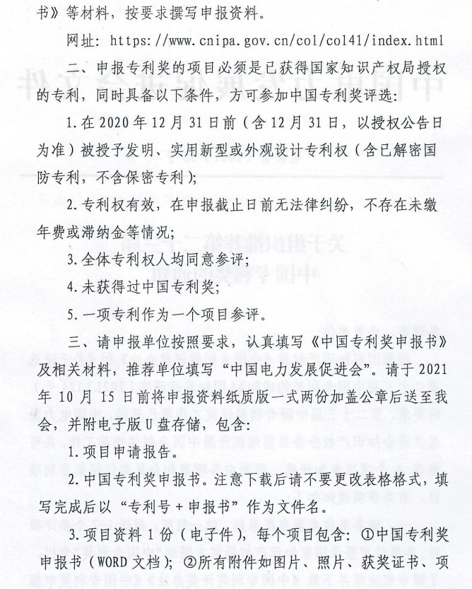 三、請(qǐng)申報(bào)單位按照要求,認(rèn)真填寫(xiě)《中國(guó)專(zhuān)利獎(jiǎng)申報(bào)書(shū)》及相關(guān)材料,推薦單位填寫(xiě)“中國(guó)電力發(fā)展促進(jìn)會(huì)”。請(qǐng)于2021年10月15日前將申報(bào)資料紙質(zhì)版一式兩份加蓋公章后送至我會(huì),并附電子版U盤(pán)存儲(chǔ),包含: