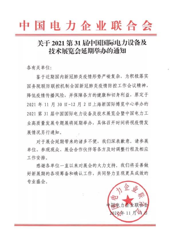 關(guān)于 “ 2021上海國(guó)際電力電工展 ” 延期舉辦通知