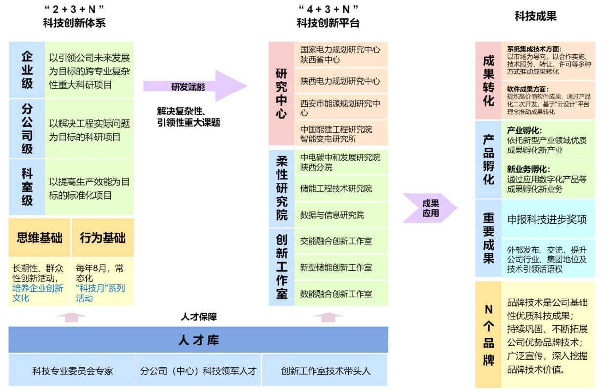 系統(tǒng)重構(gòu)科技研發(fā)體系。建立“2+3+N”差異化科技創(chuàng)新研發(fā)體系(2個(gè)基礎(chǔ),3層級(jí)研發(fā)項(xiàng)目,N項(xiàng)品牌技術(shù)):2個(gè)基礎(chǔ),即思維基礎(chǔ):開展長(zhǎng)期性、群眾性的“員工創(chuàng)新創(chuàng)效大賽”;行為基礎(chǔ):每年常態(tài)化開展“科技月”系列活動(dòng)。3個(gè)層級(jí),即科室級(jí)以提高生產(chǎn)效能為目標(biāo)的標(biāo)準(zhǔn)化項(xiàng)目,分公司級(jí)以解決工程實(shí)際問題為目標(biāo)的科研項(xiàng)目,企業(yè)級(jí)以引領(lǐng)公司未來發(fā)展為目標(biāo)的跨專業(yè)復(fù)雜性科研項(xiàng)目。此外,通過“員工創(chuàng)新創(chuàng)效競(jìng)賽”,補(bǔ)齊陜西院研發(fā)體系中面向員工層面的科技創(chuàng)新機(jī)制拼圖。N項(xiàng)品牌,即鞏固“特高壓輸電線路”“超高壓電纜”“地下變電站”“蘭炭尾氣發(fā)電”“背壓機(jī)組”等傳統(tǒng)品牌優(yōu)勢(shì),拓展“源網(wǎng)荷儲(chǔ)一體化”“風(fēng)光水火儲(chǔ)一體化”“生物質(zhì)及固廢綜合利用”等創(chuàng)新品牌技術(shù)。差異化科技創(chuàng)新體系的建成,讓技術(shù)優(yōu)勢(shì)轉(zhuǎn)化成市場(chǎng)競(jìng)爭(zhēng)優(yōu)勢(shì),充分發(fā)揮科技創(chuàng)新對(duì)業(yè)務(wù)發(fā)展的支撐和驅(qū)動(dòng)作用。