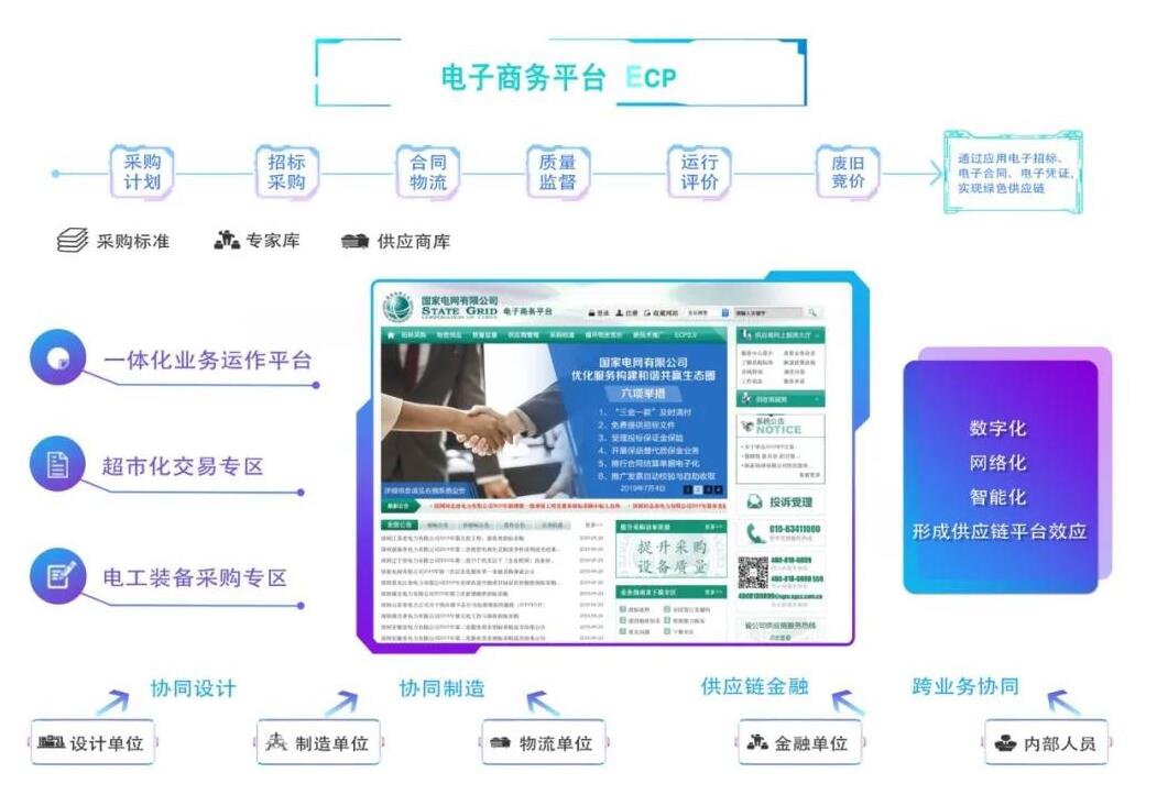 電子商務(wù)平臺ECP(E-Commercial Platform)著力實現(xiàn)“業(yè)務(wù)一條線”,覆蓋從采購計劃、招標采購、合同物流、質(zhì)量監(jiān)督、運行評價、供應(yīng)商管理到廢舊物資處置的供應(yīng)鏈全流程業(yè)務(wù),通過與供應(yīng)商有效協(xié)同,提升供應(yīng)鏈協(xié)同效率和質(zhì)量。