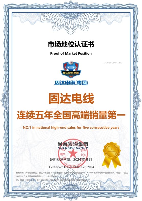 2024年12月,尚普咨詢集團在中國貴州安順舉辦的固達電線連續(xù)五年全國高端銷量第一發(fā)布儀式上向固達電線頒發(fā)市場地位認證書。此次固達電線榮獲尚普咨詢【固達電線連續(xù)五年全國高端銷量第一】認證,標志著固達電線在我國高端電線行業(yè)中領導地位的認定及市場的高度認可。