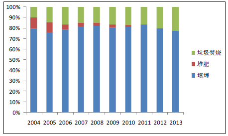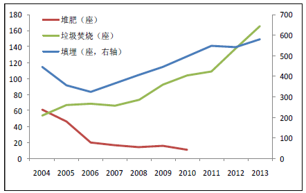 垃圾焚燒可以快速處理堆積成山的垃圾,有效減小垃圾的體積50%-90%,同時(shí)通過焚燒發(fā)電, 既解決了垃圾填埋的占地、污染問題,又實(shí)現(xiàn)了能源的清潔回收利用。目前,我國城市生活垃圾累積堆存量已達(dá)70 億噸,據(jù)國家統(tǒng)計(jì)局?jǐn)?shù)據(jù)顯示,截止2013 年我國生活垃圾填埋比例占68.2%, 垃圾焚燒僅占30.1%。