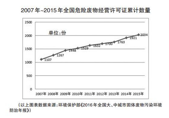 環(huán)境保護(hù)部近日公布的《2016年全國大、中城市固體廢物污染環(huán)境防治年報(bào)》(以下簡(jiǎn)稱《2016年報(bào)》)顯示,全國危險(xiǎn)廢物處理能力明顯提高,截至2015年底,各省(區(qū)、市)累計(jì)頒發(fā)的危險(xiǎn)廢物(含醫(yī)療廢物)經(jīng)營許可證共2034份,比2014年增加113份,全國危險(xiǎn)廢物經(jīng)營單位核準(zhǔn)危廢處理能力達(dá)5263萬噸/年,較同期提高959萬噸/年。
