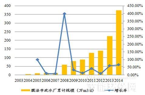 市政大規(guī)模MBR應用和膜法市政水廠規(guī)模變化與膜法水處理行業(yè)產值變化趨勢高度一致
