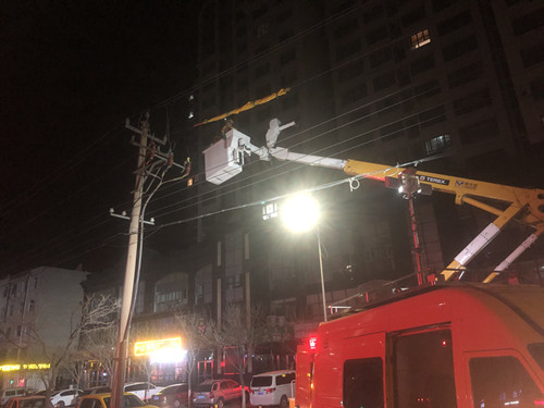 在應(yīng)急搶修燈的照明下,絕緣斗臂車(chē)絕緣臂緩緩升起,作業(yè)人員緩緩向作業(yè)點(diǎn)靠近,由于是夜間帶電搶修,作業(yè)能見(jiàn)度等條件較為不足,工作負(fù)責(zé)人不敢有一絲大意,嚴(yán)密監(jiān)護(hù)作業(yè)人員的行為。兩名帶電作業(yè)操作人員站在10多米高空的作業(yè)斗內(nèi),小心翼翼的包絕緣毯,套絕緣管,更換燒壞的熔斷器……一道道作業(yè)流程嚴(yán)謹(jǐn)有序,經(jīng)過(guò)3個(gè)半小時(shí)的連續(xù)搶修,故障搶修順利結(jié)束,受損線(xiàn)路恢復(fù)供電。