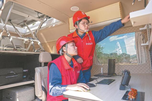 無人機(jī)智能巡檢黨員突擊隊隊員在無人機(jī)巡檢“航母”作業(yè)車內(nèi)查看山區(qū)輸配電線路情況