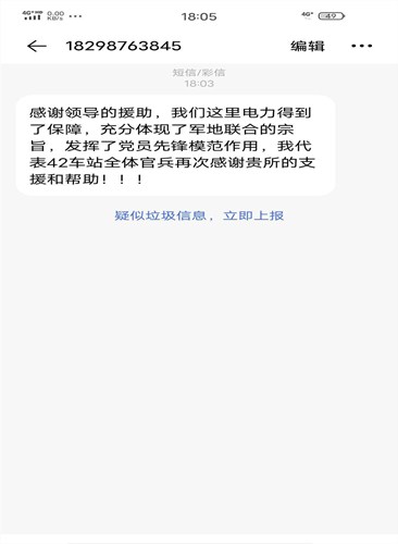中國電力網訊 “感謝貴所的援助,我們這里電力得到了保障,充分體現(xiàn)了軍地聯(lián)合的宗旨,發(fā)揮了黨員先鋒模范作用,我代表42號車站全體官兵再次感謝貴所的支援和幫助!”這是一份來自國網甘肅肅南縣供電公司蓮花供電所管轄范圍內的解放軍42號車站站長發(fā)來的感謝短信,這份不尋常的感謝短信里表達著他們對該公司搶修人員快速解決部隊用電故障的感激之情。