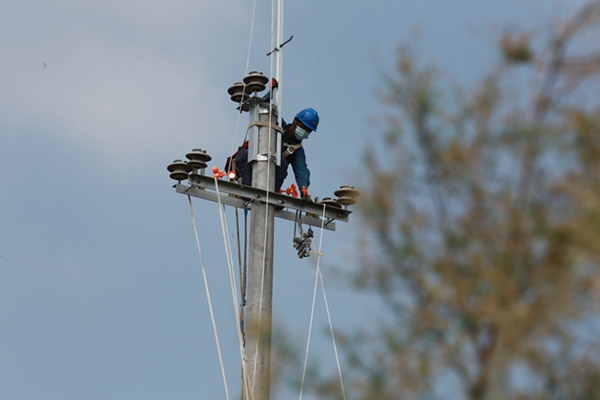 近日,在文家街道西河村,電力工作人員正在架設(shè)導(dǎo)線,將用電量超負(fù)荷的逢源線進(jìn)行割接,通過將線路延伸從而解決一部分用戶的用電低壓問題。