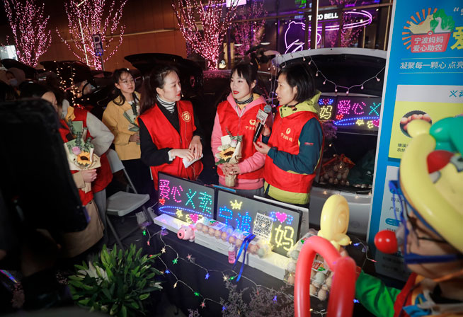“我們下午15時就到廣場開始布置了。”張亞芬說,當天下午她帶著丈夫、女兒和公司10多位志愿者早早地在寒風里做起了義賣前準備工作。雞蛋、鮮花、智能感應燈,所有的義賣商品擺放得齊齊整整。晚上18時,隨著音樂的響起,公益義賣正式開始,過往的行人來到“寧波媽媽”公益攤位前選購起來。