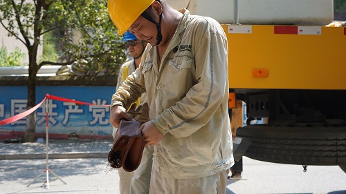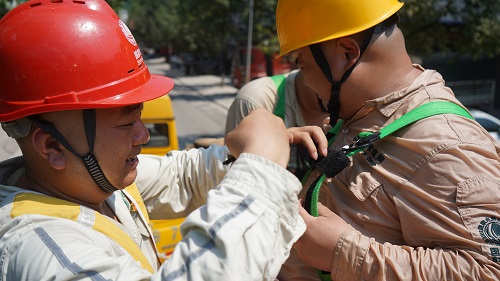 “帶電作業(yè)的方法有三種,分別是中間電位作業(yè)法、地電位作業(yè)法以及等電位作業(yè)法,今天我們采用的中間電位作業(yè)法。今天天氣不錯(cuò),雖然溫度高,但濕度低,能夠滿(mǎn)足帶電作業(yè)條件。帶電作業(yè)必須身著密不透風(fēng)的絕緣套裝,在高溫下,作業(yè)人員體感往往會(huì)達(dá)到60℃。雖然辛苦,但只要能少停電,盡可能的給人民群眾帶去清涼,再苦再累都值得。”帶電作業(yè)班班長(zhǎng)張敏說(shuō)道。