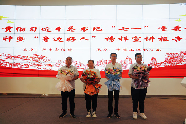 報告會上,四位宣講人用質(zhì)樸的語言、鮮活的事例,講述了一個個溫暖感人的真實故事——在平凡崗位上用堅韌與執(zhí)著為電網(wǎng)安全撐起了一片晴朗的天空,對電力事業(yè)有著無限忠誠的越志軍;用一顆真誠心充當“武器”,用淋漓的汗水支撐起使命,用堅定的意志承擔起疫情防控工作的電力人吳飛云鵬;工作中兢兢業(yè)業(yè)、勤勤懇懇,生活中助人為樂、傳承美德,用實際行動踐行著電力人的擔當與奉獻的楊俊芝;九年征程一心堅持,發(fā)揮基層黨組織的戰(zhàn)斗堡壘作用,為社區(qū)居民解決難事,為受難群眾提供幫助的康煒。他們的故事感人至深、催人奮進,生動呈現(xiàn)了“身邊好人”的愛舉、壯舉、善舉、孝舉、義舉引起了現(xiàn)場強烈共鳴,感染著現(xiàn)場所有人。宣講結(jié)束后,志愿者們?yōu)榈綀龅?ldquo;身邊好人”獻花,大家紛紛表示要學習“身邊好人”,傳遞榜樣力量,奮斗新時代。