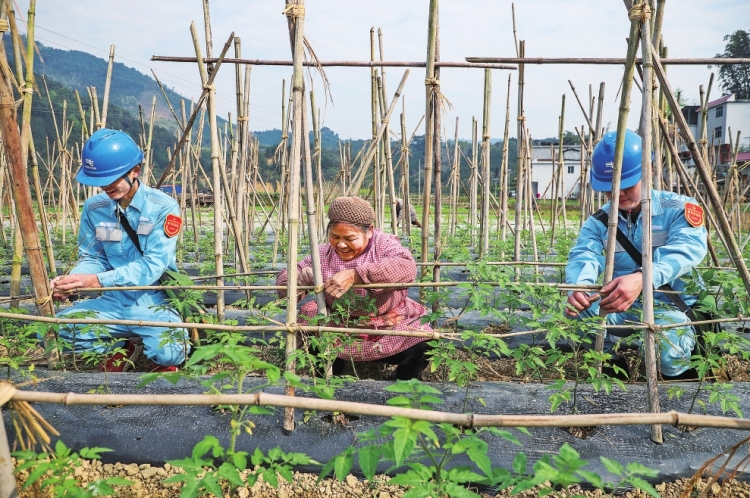 3. 黨員服務(wù)隊(duì)隊(duì)員幫助村民羅彩金綁扎番茄架。