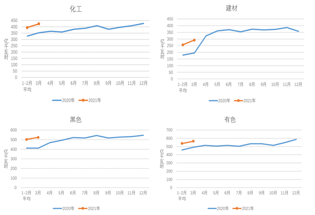 1-3月,化工行業(yè)用電量1214億千瓦時(shí),同比增長(zhǎng)14.0%,增速比上年同期提高19.8個(gè)百分點(diǎn);建材行業(yè)用電量805億千瓦時(shí),同比增長(zhǎng)40.9%,增速比上年同期提高59.8個(gè)百分點(diǎn);黑色金屬冶煉行業(yè)用電量1530億千瓦時(shí),同比增長(zhǎng)20.9%,增速比上年同期提高24.1個(gè)百分點(diǎn);有色金屬冶煉行業(yè)用電量1639億千瓦時(shí),同比增長(zhǎng)12.1%,增速比上年同期提高11.2個(gè)百分點(diǎn)。