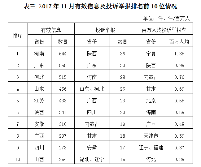 2017年11月,各?。ㄗ灾螀^(qū)、直轄市)按照有效信息數(shù)量排序,河南、廣東、河北等省列全國前10位;按照投訴舉報數(shù)量排序,陜西、廣東、河南等省排在全國前10位;按照百萬人均投訴舉報率排序,寧夏,陜西,內(nèi)蒙古等省位于全國前10位。(2017年11月有效信息及投訴舉報排名前10位情況見表三)