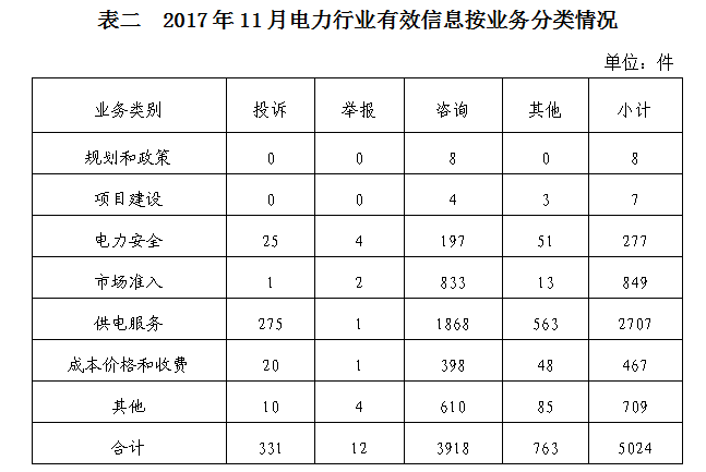 2017年11月收到的有效信息中,電力行業(yè)類5024件,占69.74%;新能源和可再生能源行業(yè)類1270件,占17.63%;石油天然氣行業(yè)類134件,占1.86%;煤炭行業(yè)類2件,占0.03%;其他事項774件,占10.74%。