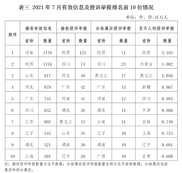 各省(自治區(qū)、直轄市)按照接收的有效信息數量排序,河南、陜西、山東、河北、廣東、四川、江蘇、遼寧、湖北、上海列全國前10位;按照接收的投訴舉報數量排序,陜西、四川、河北、廣東、河南、湖北、黑龍江、山東、湖南、遼寧排在全國前10位;按照辦結屬實的投訴舉報數量排序,陜西、四川、黑龍江、廣東、河南、湖北、云南、遼寧、湖南、廣西排在全國前10位;按照百萬人均投訴舉報數量排序,陜西、內蒙古、黑龍江、新疆、四川、天津、吉林、上海、遼寧、甘肅排在全國前10位。(2021年7月有效信息及投訴舉報排名前10位情況見表三)