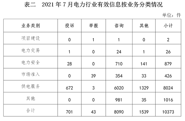 電力行業(yè)排在首位,有效信息數量為10373件,占全部有效信息的80.90%。群眾關注的內容主要集中在故障停電、供電安全、電表計量咨詢等方面。(2021年7月電力行業(yè)有效信息按業(yè)務分類情況見表二)