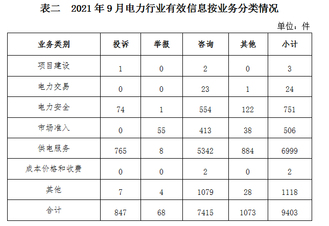 電力行業(yè)排在首位,有效信息數(shù)量為9403件,占全部有效信息的76.49%。群眾關(guān)注的內(nèi)容主要集中在有序用電、故障停電、供電安全等方面。(2021年9月電力行業(yè)有效信息按業(yè)務分類情況見表二)