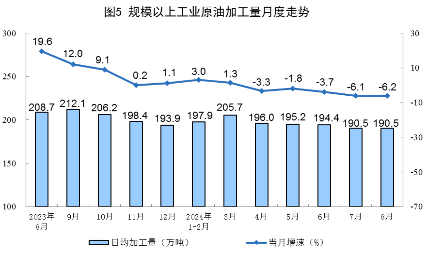 原油加工有所下降。8月份,規(guī)上工業(yè)原油加工量5907萬噸,同比下降6.2%;日均加工190.5萬噸。1—8月份,規(guī)上工業(yè)原油加工量47253萬噸,同比下降1.2%。