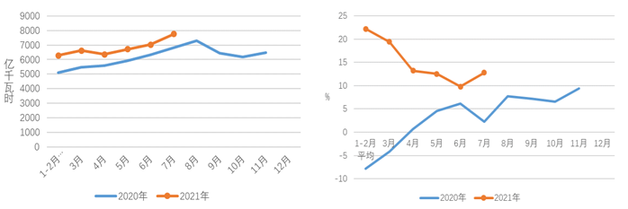 1-7月份,全國工業(yè)用電量同比增長15.2%,增速同比提高17.4個(gè)百分點(diǎn)。全國制造業(yè)用電量同比增長16.8%,增速同比提高18.7個(gè)百分點(diǎn)。制造業(yè)中,四大高載能行業(yè)合計(jì)用電量同比增長12.5%,其中,建材行業(yè)同比增長17.1%,黑色行業(yè)同比增長14.5%,化工行業(yè)同比增長11.4%,有色行業(yè)用電量同比增長9.0%;高技術(shù)及裝備制造業(yè)合計(jì)用電同比增長24.7%,其中,電氣機(jī)械和器材制造業(yè)、汽車制造業(yè)、儀器儀表制造業(yè)、通用設(shè)備制造業(yè)、計(jì)算機(jī)/通信和其他電子設(shè)備制造業(yè)、專用設(shè)備制造業(yè)、金屬制品業(yè)同比增長超過20%,分別為33.3%、29.9%、28.9%、27.5%、27.1%、22.0%和20.3%;消費(fèi)品制造業(yè)合計(jì)用電同比增長20.3%,其中,家具制造業(yè)、文教/工美/體育和娛樂用品制造業(yè)、紡織服裝/服飾業(yè)、木材加工和木/竹/藤/棕/草制品業(yè)、皮革/毛皮/羽毛及其制品和制鞋業(yè)、紡織業(yè)、印刷和記錄媒介復(fù)制業(yè)同比增長超過20%,分別為31.4%、27.4%、27.3%、26.3%、25.4%、25.3%和21.3%。