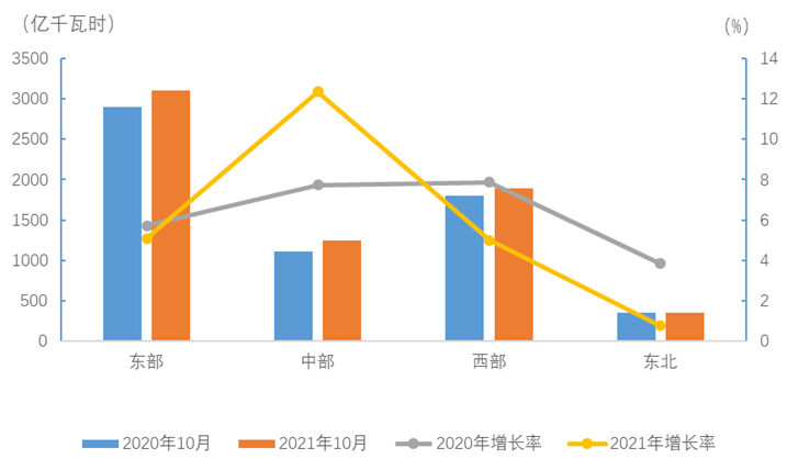 10月份,東、中、西部和東北地區(qū)全社會用電量增速分別為5.1%、12.3%、5.0%和0.8%。
