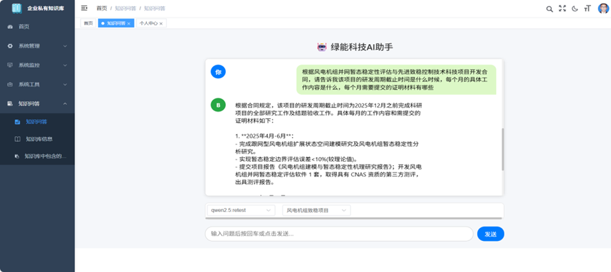 秉持“讓數(shù)據(jù)多跑路、員工少跑腿”理念,綠能科技利用開源大模型平臺自主部署本地化企業(yè)私有知識庫智能問答系統(tǒng),并在內(nèi)部投入試運(yùn)行。知識庫整合海量技術(shù)文檔、科技項(xiàng)目管理文檔、制度文件等材料,通過智能語義檢索提供精準(zhǔn)的工作指引與政策解讀,員工可隨時通過系統(tǒng)獲取標(biāo)準(zhǔn)化操作規(guī)范,信息查詢效率提升70%,有效消除重復(fù)溝通和無效勞動。此外,綠能科技自主開發(fā)的報(bào)表輔助助手先后在生產(chǎn)運(yùn)營中心、電力交易中心投入運(yùn)行。報(bào)表輔助助手運(yùn)用自動化算法替代傳統(tǒng)人工數(shù)據(jù)收集、整理與合并,實(shí)現(xiàn)一鍵自動生成報(bào)表,報(bào)表處理時效提升90%,從根本上減輕基層員工報(bào)表壓力,將人力從低效重復(fù)勞動中解放出來。