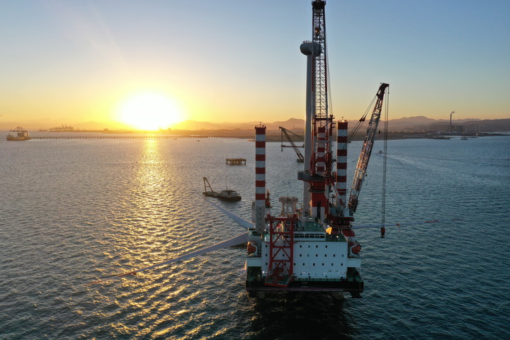 福建福清興化灣二期三峽海上風(fēng)電場(chǎng)10兆瓦風(fēng)機(jī)吊裝現(xiàn)場(chǎng)(無人機(jī)照片)。新華社記者 林善傳 攝(2020年6月12日攝)