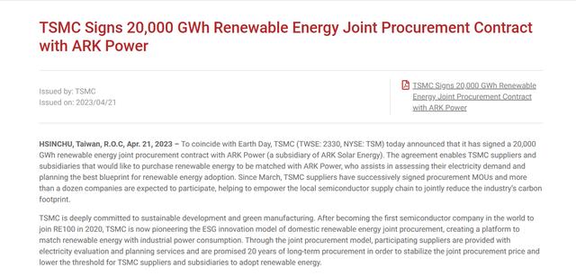 IT之家從臺積電官網(wǎng)獲悉,臺積電繼 2020 年后成為全球第一家加入全球再生能源倡議組織(RE100)的半導體企業(yè),首創(chuàng)再生能源聯(lián)合采購的 ESG 創(chuàng)新模式。