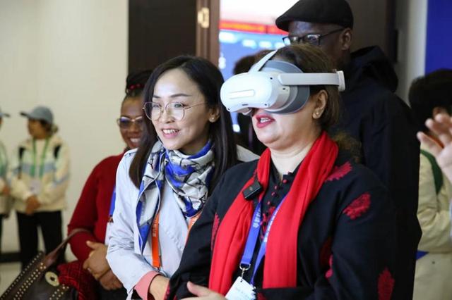 媒體代表使用VR設(shè)備感受光伏項目現(xiàn)場。