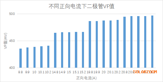 按照實(shí)測(cè)的兩個(gè)芯片VF值相差3mV來(lái)考量的話,將正向電流區(qū)間縮小再次測(cè)試,得到下圖數(shù)據(jù)??梢酝茰y(cè),如果雙芯片二極管兩個(gè)芯片間VF相差3mV,則2個(gè)芯片間分流相差不超過(guò)0.2A。實(shí)際上,在二極管結(jié)溫測(cè)試以及光伏組件戶外使用時(shí),0.2A的電流也是完全在誤差波動(dòng)范圍內(nèi)。