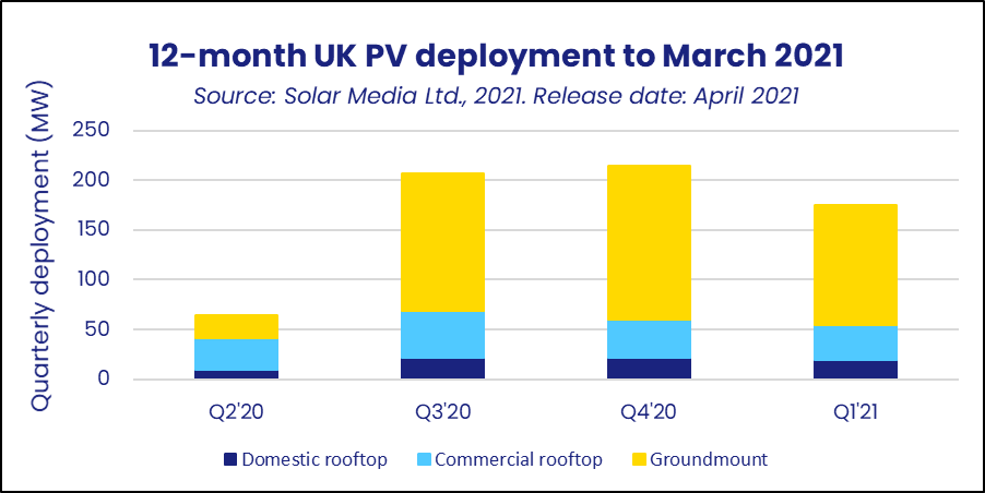 截止到3月底的12個月中,英國新增并網(wǎng)太陽能發(fā)電容量660兆瓦。根據(jù)英國太陽能協(xié)會數(shù)據(jù),預計2021年,全國新增安裝量可能達到1,000兆瓦,因為在三個主要市場,即住宅,商業(yè)屋頂和地面安裝市場均實現(xiàn)增長。