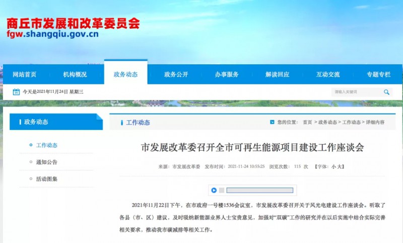11月19日,商丘市發(fā)改委發(fā)布一則關(guān)于風(fēng)光電新能源項(xiàng)目建設(shè)事宜的通知。要求光伏、風(fēng)電項(xiàng)目建設(shè)必須同步配套產(chǎn)業(yè)以及簽訂碳指標(biāo)協(xié)議。沒有達(dá)到要求的未施工項(xiàng)目,繼續(xù)暫停實(shí)施;達(dá)不到規(guī)定要求的企業(yè),項(xiàng)目建設(shè)指標(biāo)收回。
