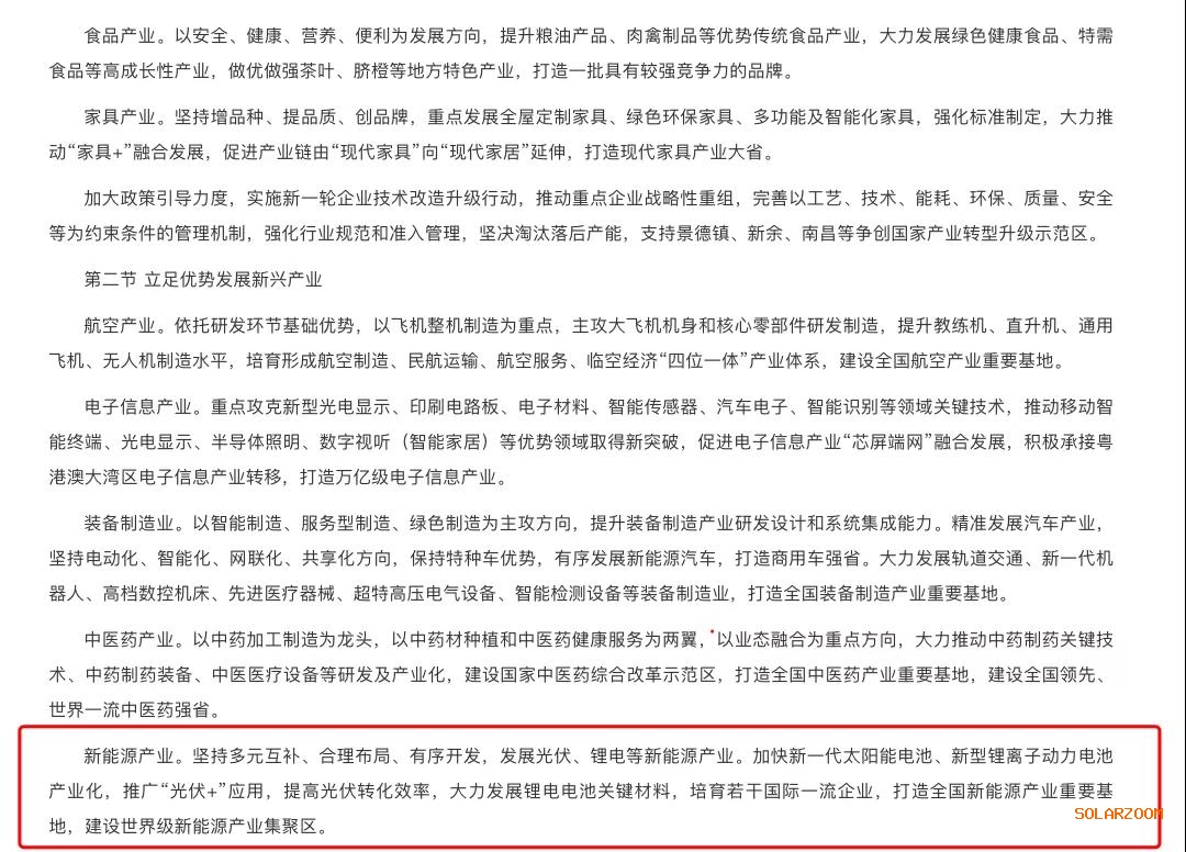 除發(fā)電端外,江西省在“十四五”期間,將加快新一代太陽(yáng)能電池、新型鋰離子動(dòng)力電池產(chǎn)業(yè)化,推廣“光伏+”應(yīng)用,提高光伏轉(zhuǎn)化效率,大力發(fā)展鋰電電池關(guān)鍵材料,培育若干國(guó)際一流企業(yè),打造全國(guó)新能源產(chǎn)業(yè)重要基地,建設(shè)世界級(jí)新能源產(chǎn)業(yè)集聚區(qū)。