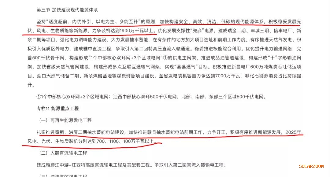 文件顯示,江西省將在“十四五”期間堅(jiān)持“適度超前、內(nèi)優(yōu)外引、以電為主、多能互補(bǔ)”的原則,加快構(gòu)建安全、高效、清潔、低碳的現(xiàn)代能源體系。積極穩(wěn)妥發(fā)展光伏、風(fēng)電、生物質(zhì)能等新能源,到2025年力爭(zhēng)裝機(jī)達(dá)到1900萬(wàn)千瓦以上。其中,風(fēng)電、光伏、生物質(zhì)裝機(jī)分別達(dá)到700、1100、100萬(wàn)千瓦以上。
