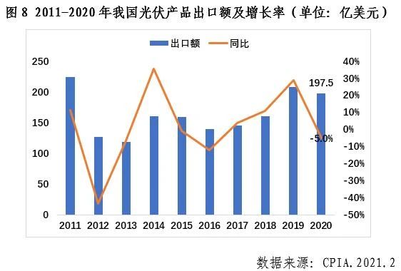 摘要:2020年,受新冠肺炎疫情的影響,全球經(jīng)濟(jì)倒退,然而我國光伏行業(yè)逆流而上,取得了令人矚目的成就,保持并延續(xù)了多項(xiàng)世界第一。應(yīng)用市場實(shí)現(xiàn)恢復(fù)性增長,2020年我國光伏新增裝機(jī)48.2GW,連續(xù)8年位居全球首位;累計裝機(jī)量達(dá)到253GW,連續(xù)6年位居全球首位;產(chǎn)業(yè)規(guī)模持續(xù)擴(kuò)大,制造端四個主要環(huán)節(jié)實(shí)現(xiàn)兩位數(shù)增長,多晶硅產(chǎn)量39.2萬噸,連續(xù)10年位居全球首位;光伏組件產(chǎn)量124.6GW,連續(xù)14年位居全球首位;出口市場穩(wěn)中有升,光伏產(chǎn)品出口額197.5億美元,同比下降5%,但組件出口量則達(dá)到78.8GW,創(chuàng)歷史新高,同比增長18.3%。