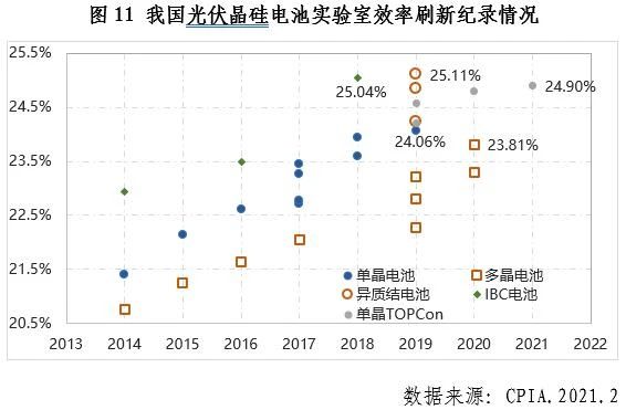 實(shí)驗(yàn)室方面,2020年4月,晶科研發(fā)的多晶硅(Multicrystalline)電池片實(shí)驗(yàn)室效率達(dá)到23.3%,并被收錄于NREL電池片轉(zhuǎn)換效率紀(jì)錄表中,隨后阿特斯宣布將該效率提高至23.81%。7月,晶科宣布其研發(fā)的N型單晶硅單結(jié)電池片效率達(dá)到24.79%,2021年1月,將該紀(jì)錄再次刷新到24.90%,創(chuàng)造了新的大面積N型單晶鈍化接觸電池片效率世界紀(jì)錄。我國除了在晶硅電池技術(shù)方面領(lǐng)先全球外,鈣鈦礦、有機(jī)電池等電池片實(shí)驗(yàn)室效率也走在世界前列,2020年7月,杭州纖納光電以18.04%的鈣鈦礦小組件光電轉(zhuǎn)換效率的成績,第七次蟬聯(lián)了鈣鈦礦小組件世界紀(jì)錄榜首。目前NREL電池片轉(zhuǎn)換效率紀(jì)錄表中,除晶科的多晶硅電池片外,上海交大/北航、中科院化學(xué)所和漢能分別研發(fā)的有機(jī)電池、有機(jī)疊層電池和薄膜電池仍保持著世界紀(jì)錄。