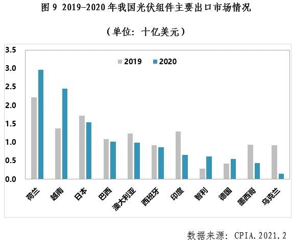 從光伏組件出口市場來看,2020年光伏組件主要出口市場中傳統(tǒng)市場活力不減,其中荷蘭和越南市場份額增長明顯。在光伏發(fā)電成本持續(xù)降低以及歐盟綠色協(xié)議的背景下,歐洲市場保持增長勢頭,荷蘭作為歐洲市場的集散中心出口量持續(xù)增長。越南新一輪FIT政策引發(fā)了越南屋頂光伏的搶裝熱潮,根據(jù)越南工貿(mào)部的公告顯示,2020年越南光伏新增裝機(jī)為10.75GW,成為全球前3大光伏市場,其中屋頂光伏裝機(jī)超過9GW。越南市場新增裝機(jī)猛增,對我國組件需求明顯增長,成為第二大光伏組件出口市場。印度市場受疫情影響,市場需求下降較為明顯。曾經(jīng)的新興市場烏克蘭因其國內(nèi)電價的下降致使光伏項(xiàng)目的收益有所降低,投資熱情減退,市場需求下降。墨西哥市場受到清潔能源拍賣的取消以及后續(xù)政策不確定性的影響未能延續(xù)之前的增長勢頭,市場需求有所下降。