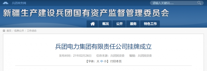 2月26日,從兵團國資委獲悉,新疆生產(chǎn)建設兵團電力集團有限責任公司在烏魯木齊舉行揭牌儀式,宣布正式成立。兵團電力集團有限責任公司是兵團國資國企改革中兵團本級成立的第一個產(chǎn)業(yè)集團公司,企業(yè)注冊資本金5億元,是新疆電力市場的重要主體和能源產(chǎn)業(yè)的新興力量。