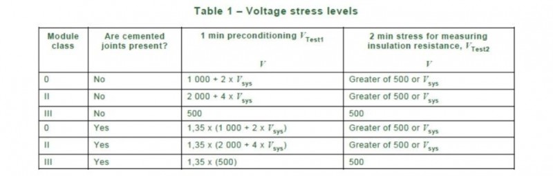 2. 絕緣測(cè)試 (MQT 03)依據(jù)組件的防護(hù)等級(jí)區(qū)分絕緣測(cè)試試加電壓等級(jí),參考以下表格: