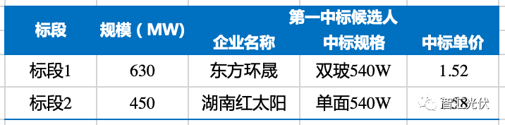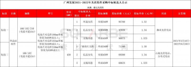 根據(jù)索比光伏網(wǎng)統(tǒng)計(jì),廣州發(fā)展集采標(biāo)段一中標(biāo)候選人第一名為環(huán)晟光伏,投標(biāo)單價(jià)1.52元/W,且為最低投標(biāo)單價(jià),組件投標(biāo)規(guī)格為雙玻540W;標(biāo)段二中標(biāo)候選人第一名為湖南紅太陽,投標(biāo)單價(jià)1.58元/W,組件投標(biāo)規(guī)格為單面540W。詳情請見下表: