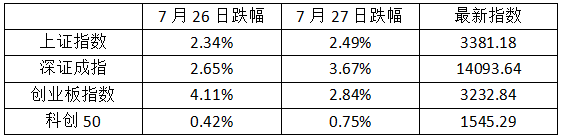 從7月26日起,A股經歷連續(xù)兩日大跌,各版塊下跌情況見下表: