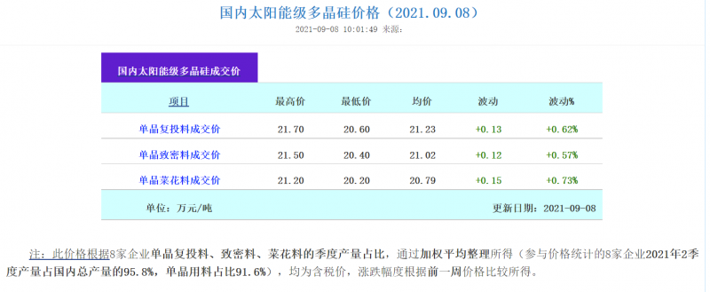 9月8日,硅業(yè)分會(huì)發(fā)布多晶硅最新價(jià)格信息。