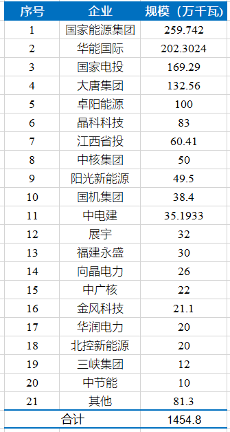 從投資企業(yè)來看,國(guó)家能源集團(tuán)及參股的項(xiàng)目的規(guī)模最大,約為2.6GW;華能及參股的項(xiàng)目的規(guī)模也超過2GW;國(guó)家電投、大唐、卓陽(yáng)能源均獲得1GW及以上規(guī)模。具體如下表所示。