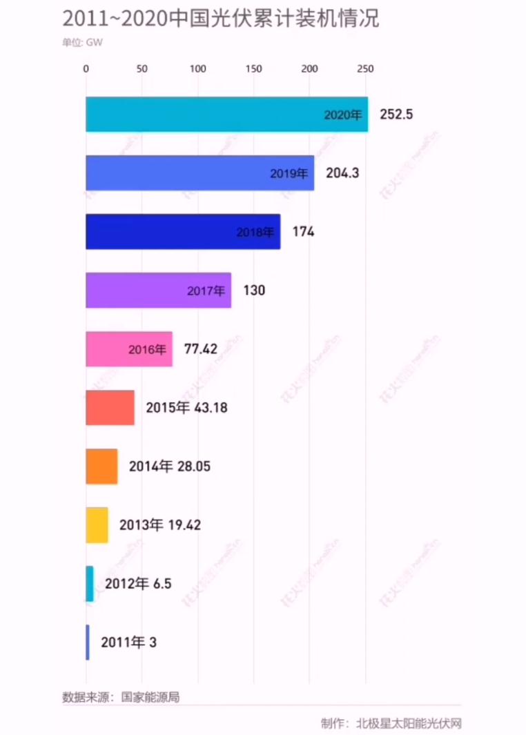 從2011年至2020年,中國光伏累計裝機(jī)從3GW增長至252.5GW,根據(jù)國家能源局?jǐn)?shù)據(jù),截至2021年6月30日,中國光伏累計裝機(jī)已達(dá)267GW,十年飆漲880%。
